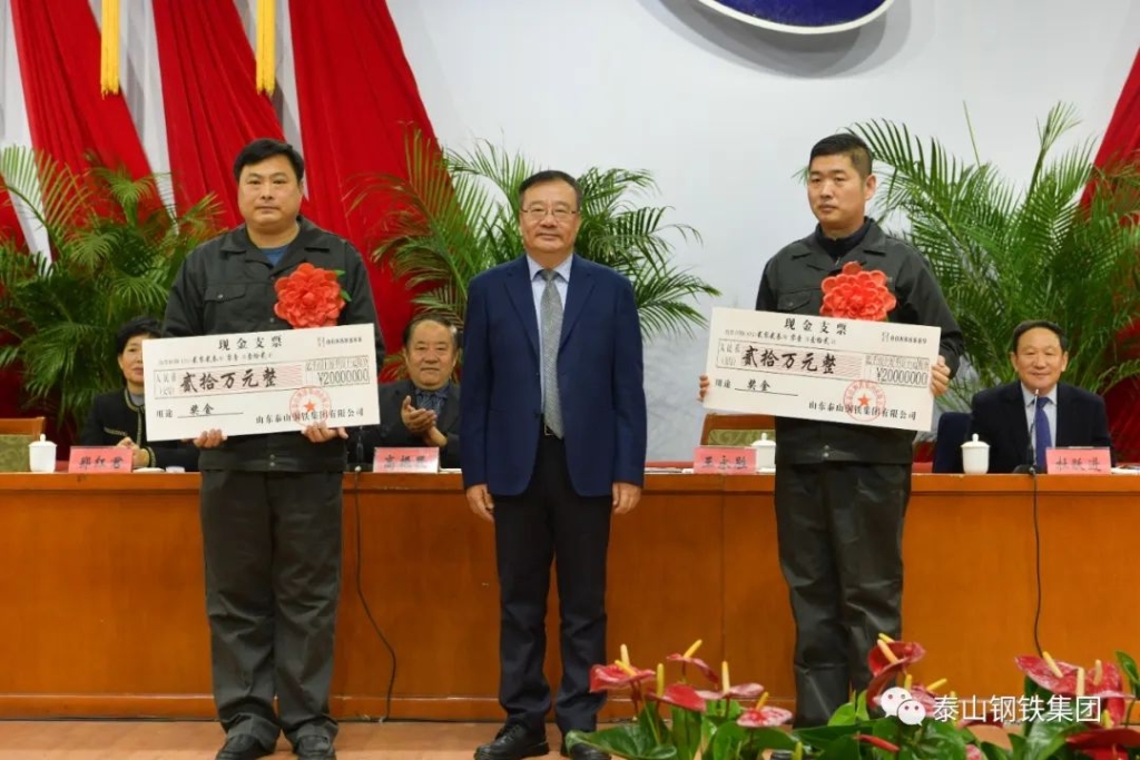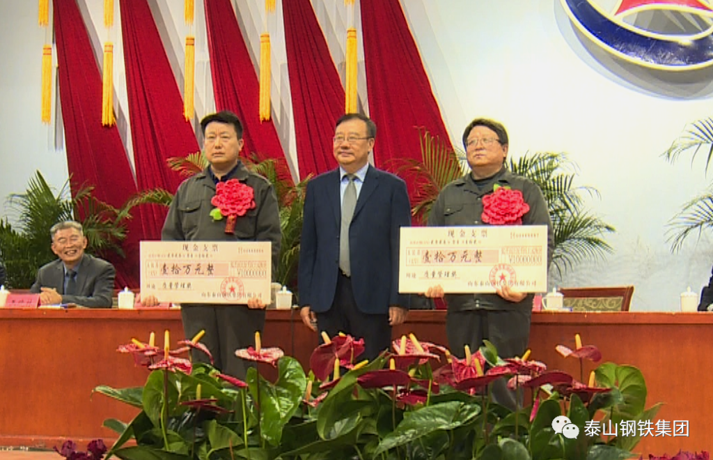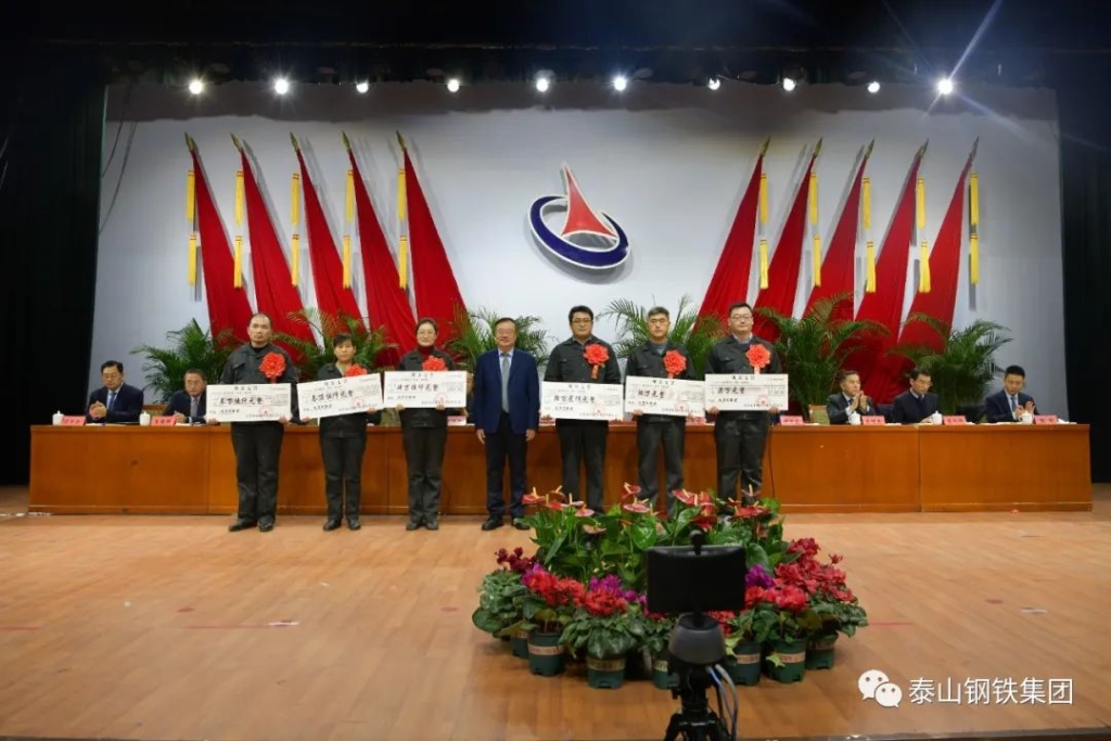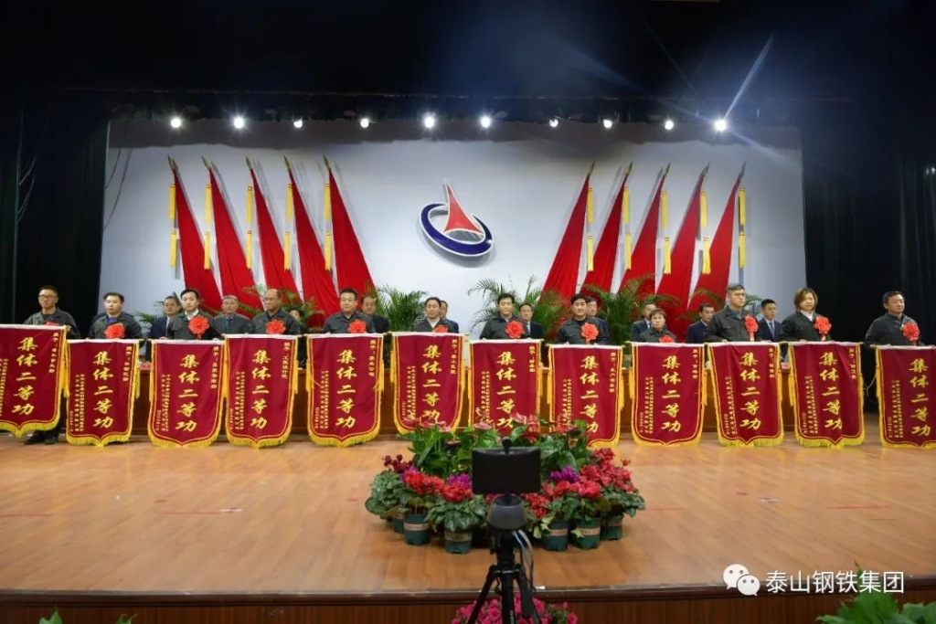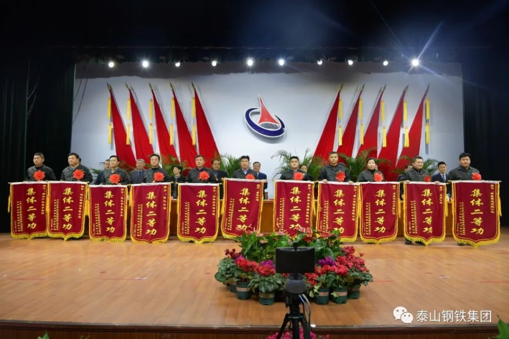 今天的中心会堂灯光璀璨、气氛热烈。主席台上方悬挂着“山东泰山钢铁集团有限公司2022年度总结表彰大会”的会标,后幕正中的泰山钢铁集团厂标熠熠生辉,10面鲜艳的红旗分列两侧。