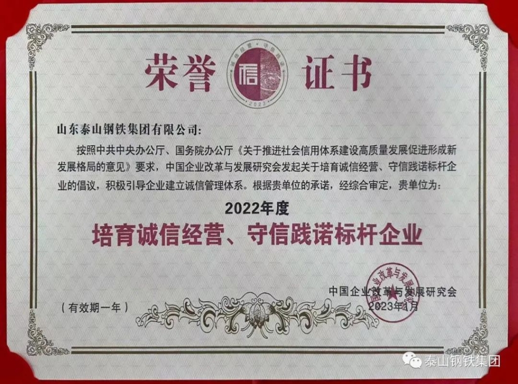 近日,中国企业改革与发展研究会公布了2022年度“培育诚信经营、守信践诺标杆企业”名单,泰山钢铁集团榜上有名。